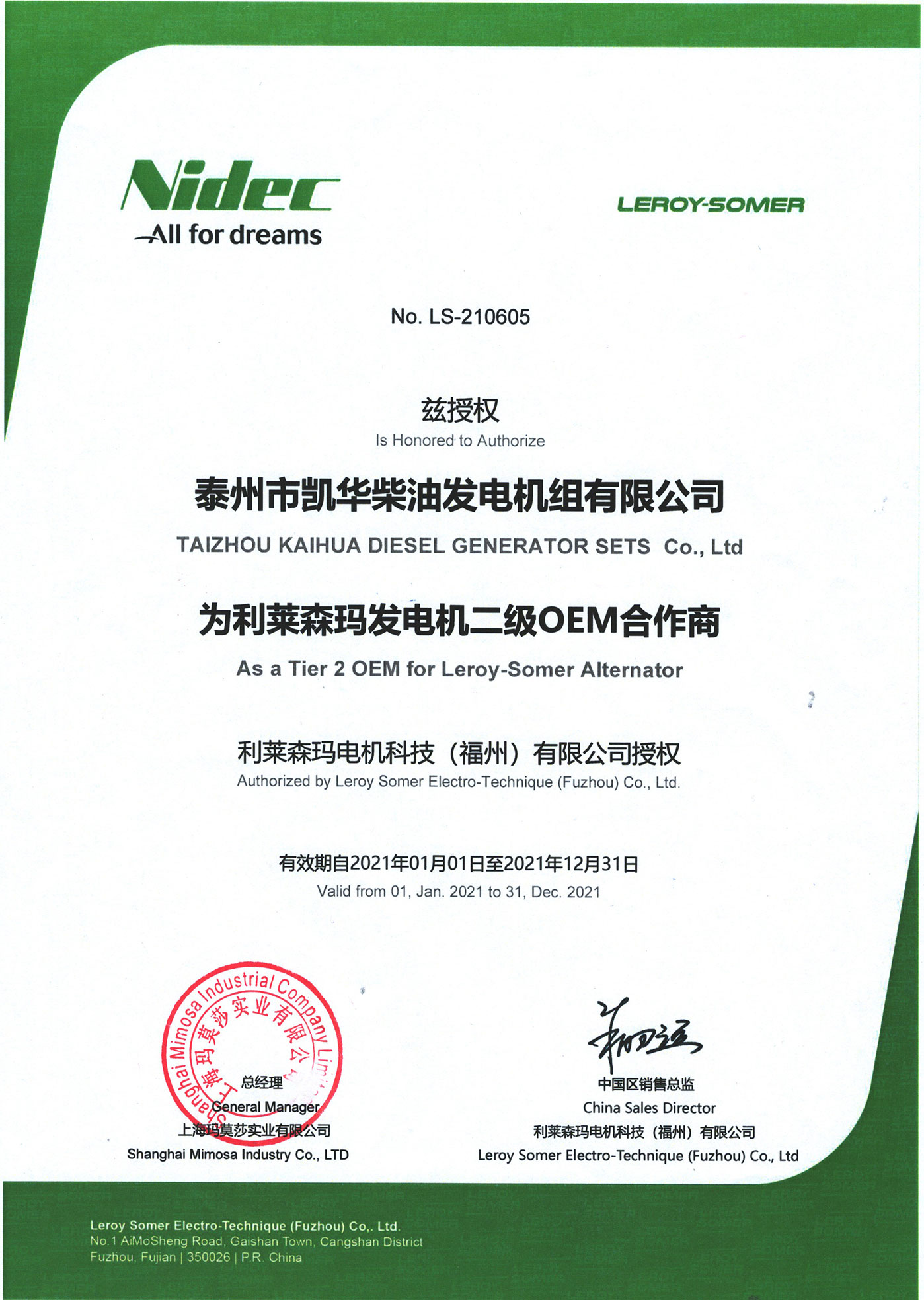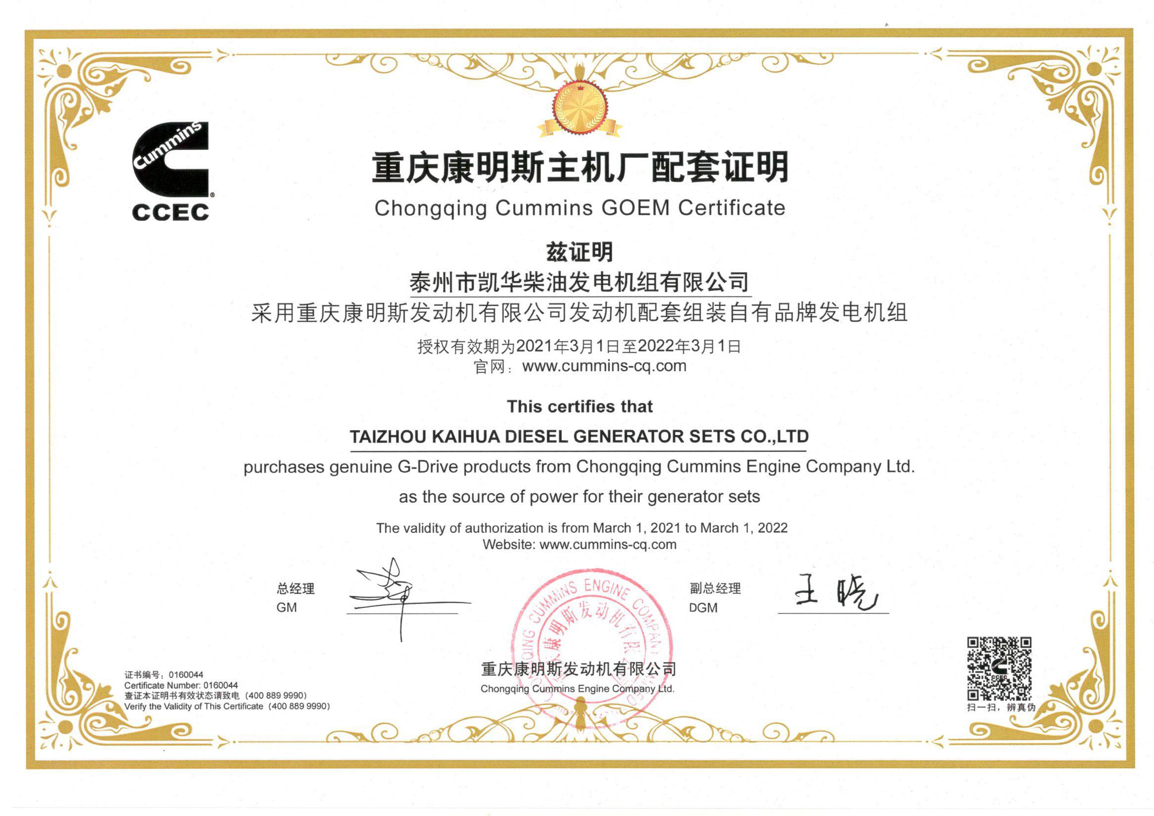 泰州市凱華柴油發(fā)電機(jī)組有限公司創(chuàng)建于2003年,是一家集柴油發(fā)電機(jī)組燃?xì)獍l(fā)電機(jī)組的研發(fā)、生產(chǎn)、銷(xiāo)售為一體的高新技術(shù)民營(yíng)企業(yè),公司座落于“漢唐古郡,淮海名區(qū)”,具有“鳳凰城”美稱(chēng)的祥泰之州——江蘇省泰州市,地處中國(guó)經(jīng)濟(jì)最發(fā)達(dá)的長(zhǎng)三角經(jīng)濟(jì)圈,水陸空立體交通,地理位置十分優(yōu)越。公司目前注冊(cè)資本金11800萬(wàn)元人民幣,生產(chǎn)基地占地六十畝,現(xiàn)有各類(lèi)高素質(zhì)員工一百多名,專(zhuān)業(yè)技術(shù)人員達(dá)46人,其中高級(jí)技術(shù)人員16人,年銷(xiāo)售額近6億元。 公司主營(yíng)產(chǎn)品:3~3000KW陸用柴油發(fā)電機(jī)組,15~600KW移動(dòng)拖車(chē)電站,12~1000KW船用應(yīng)急柴油發(fā)電機(jī)組,各種靜音型、中高壓、多機(jī)并聯(lián)、燃?xì)獾忍胤N機(jī)組以及進(jìn)口系列柴油發(fā)電機(jī)組,可滿足不同客戶的一切電力需求,還可滿足用戶不同電壓、不同頻率的要求。凱華公司是康明斯品牌的授權(quán)代理商,專(zhuān)業(yè)生產(chǎn)供應(yīng)康明斯柴油發(fā)電機(jī)組。